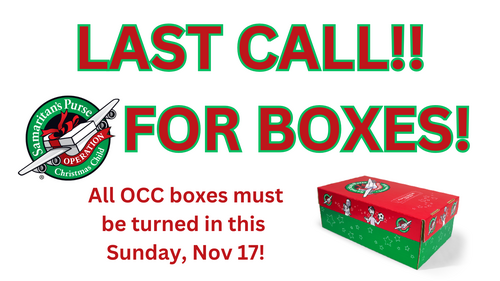 The last day to turn in donations for Operation Christmas Child is Sunday, November 17. All donations may be dropped off in the church lobby.