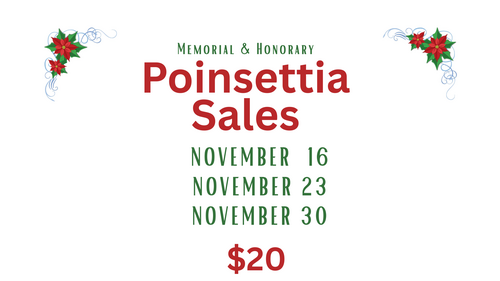 Then annual poinsettia memorial will begin November 16 through November 30, each Sunday. If you are interested in purchasing a poinsettia see Shannon or Mary Ruth.