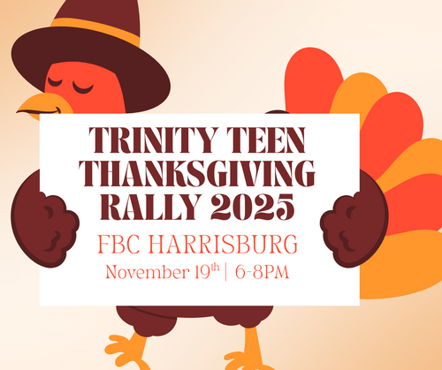 Wednesday, Nov. 19th, Trinity Baptist Association will host the first annual Thanksgiving Rally. Meal will be at 6pm with a worship time to follow. The rally will take place at FBC Harrisburg.